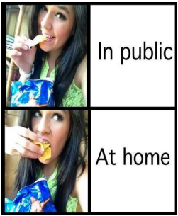 Study the following photo and text Choose the INCORRECT answer. All others are correct. The picture shows that in public, the girl ----------- one chip at a time, ------- a smile on her face.